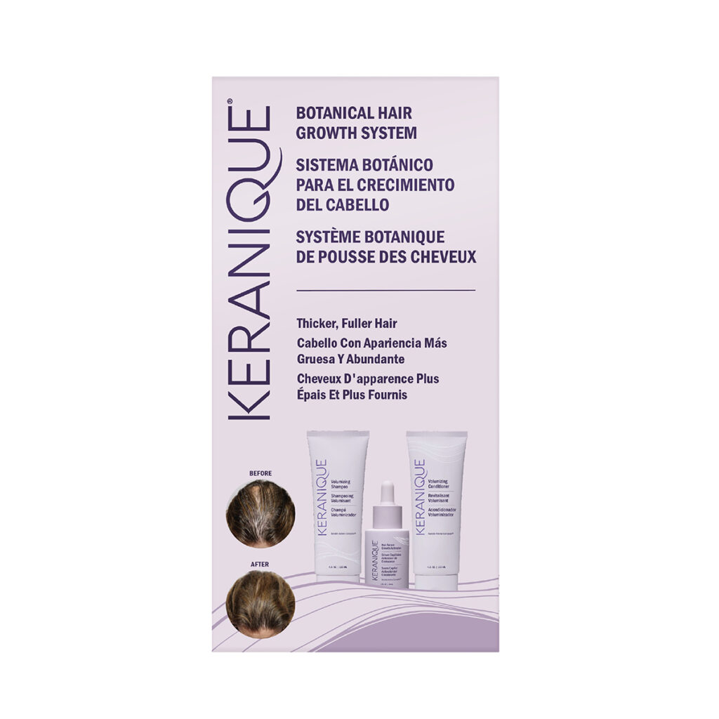 El Sistema Botánico para el Crecimiento Capilar Keranique de 3 piezas es una rutina completa diseñada para combatir el adelgazamiento del cabello en mujeres. Incluye productos formulados con ingredientes botánicos y activos especializados que trabajan en conjunto para limpiar, fortalecer y estimular el crecimiento capilar, ayudando a mejorar la densidad, el volumen y la salud general del cabello con uso constante.